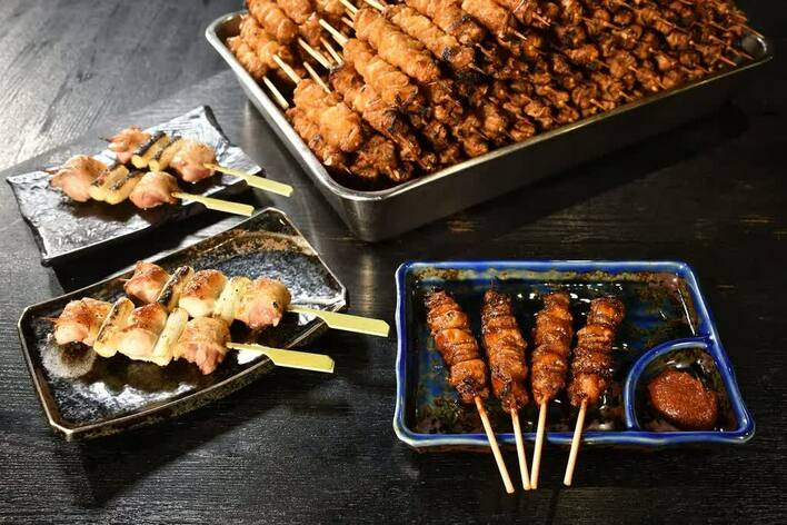 秋田の有名な祭り「竿燈まつり」の提灯に見立てたような刺し方で、「3日間で5回炙る」という秋田竿燈皮串は、最初の2日間は焼いて冷蔵庫で寝かせることを繰り返し、手間をかけて極限まで余分な脂を落とすことで本当においしい脂の旨みだけを残して、もちもちの食感に仕上げるという。