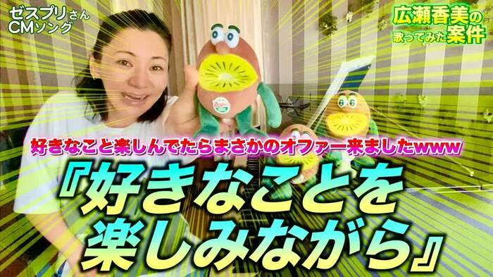 ゼスプリ・キウイブラザーズのぬいぐるみが見守る中で、いつもと変わらぬ声量とテンションで楽曲を披露。一通り歌い終わったと思ったら、なぜか再び歌い始め…という無限ループにハマりかけ、「止まらないww」「キウイ~♪」「アンコールだ!」などとファンがコメントを寄せる場面も。広瀬は宣言通り“元気”を振りまいた。
