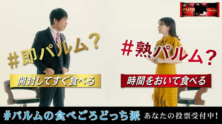 今回行われる「#パルムの食べごろどっち派」キャンペーンは、商品を冷凍庫から出してすぐに食べる「即パルム派」と、少し時間を置いてから食べる「熟パルム派」の二つの派閥に分かれ、食べ方の支持率を競い合うもの。