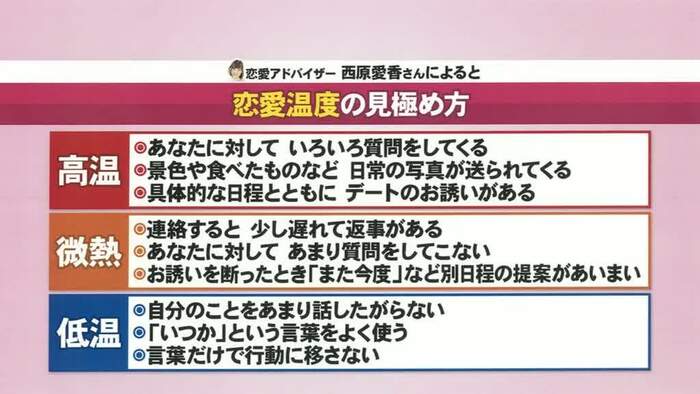 また、「初デートの後のLINEの返信がそっけなかった。対応を間違えたのか?」(20代女性)、「私は結婚したいのに、交際2年の彼が煮え切らない」(30代女性)というお悩みを受けて、西原さん流のお礼メールの送り方や、相手の“恋愛温度”の見極め方が紹介されると、三木は「恋愛は、相手が“微熱”の時にどう対応するかに尽きる」と指摘。