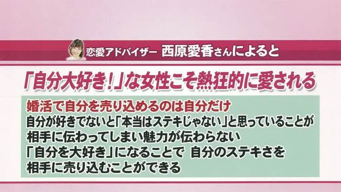 婚活が上手くいかず、自信を失ってしまう女性も多いそうだが、西原さんによると「『自分大好き!』な女性のほうが、相手から愛されやすい」のだとか。千秋は「確かに、誰にも好かれていない人を好きになる人はいない。まずは自分が自分のファンであるべき」と同意した。