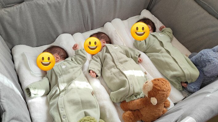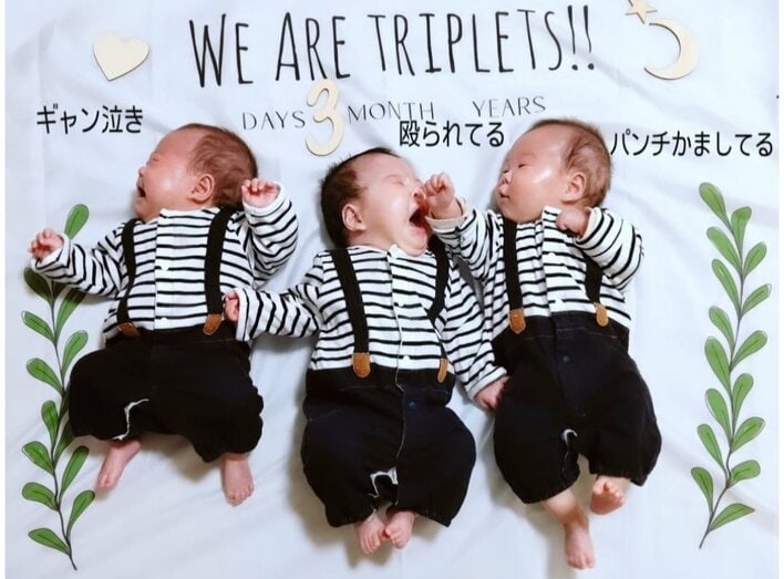 生後3ヵ月の時に撮影された写真では、おそろいの服を着た三つ子が泣いていたり、はたまたパンチのようなしぐさをしたりと、すくすくと成長中!