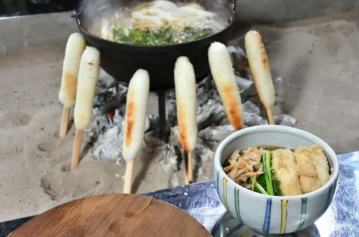 あとはたんぽを網で焦げ目がつくまで焼いていく。焼いている間に「秋田の良さってどういうところなんでしょう?」と松岡から質問されると、椛澤さんは「四季がはっきりしていて、春夏秋冬どの季節も楽しめる」と秋田の魅力をアピール。すると松岡は「僕の感覚の応援と似ている、秋田を応援しているわけですね」と、その姿勢に共感していた。