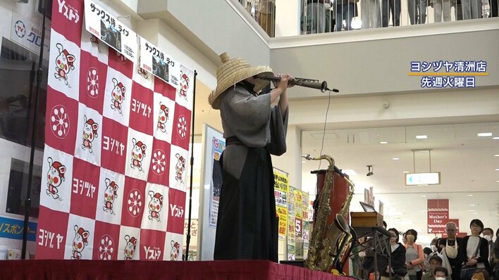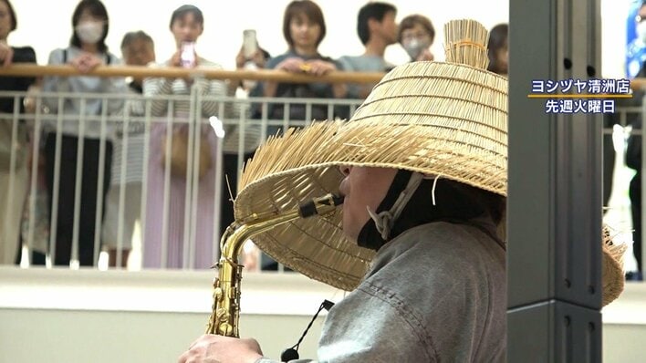 2025年5月6日、GWの最終日、愛知県のショッピングセンターに集まった1000人ほどの人だかりのお目当ては…深編みがさに侍姿でサックスを吹く人物。