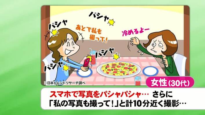「オシャレなレストランでランチをした時、友達がスマホでの撮影に10分くらい費やしていて、ついていけないと思った」という30代女性のエピソードでは、スタジオ全員が「(友達の行動が)気になる」とバッサリ。