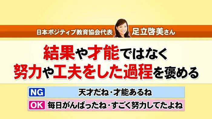 足立氏は、何かできたときも「天才!」などと結果や才能を褒めるのではなく、「毎日頑張っていたね」などと過程を褒めると良いとアドバイスを送った。