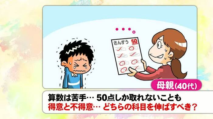 「子供の強み、伸ばすには?」というテーマでは、「小5の息子は、国語は得意だが算数は苦手。どちらを伸ばすべき?」という40代女性のお悩みが紹介された。