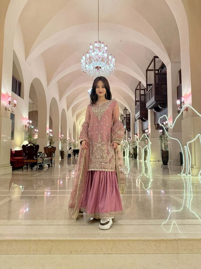 ピンクのドレスは袖部分がシースルーのデザインになっていて、いたるところに花のようなシルバーの刺繍が施され、とっても華やかな印象!