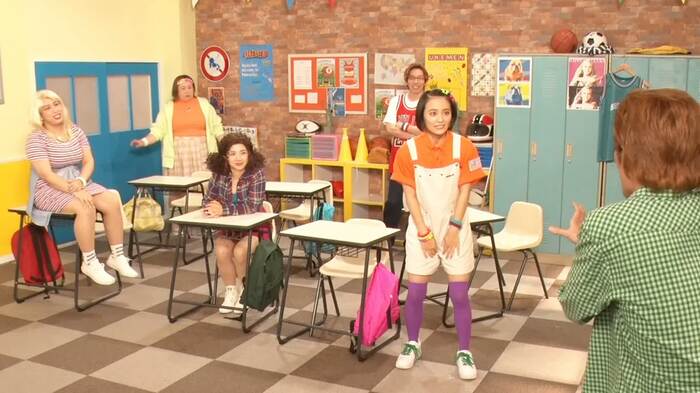岡田が参加したのは、「3字の青春白書」のコーナー。「ビバリーヒルズ青春白書」ばりのハイスクールを舞台に、3文字のワードしか使えない連想ゲームコーナーに挑んだ。“ユイトニー”として参加した岡田は、ノリノリでメンバーに馴染んでいく。