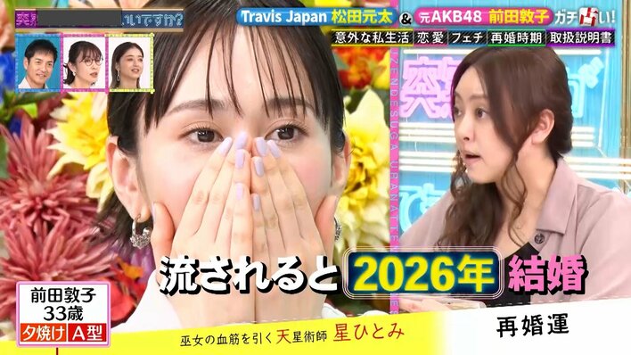 5月18日放送の『突然ですが占ってもいいですか?』は、松田元太(Travis Japan)さんと前田敦子さんが、星ひとみさんに占われました。