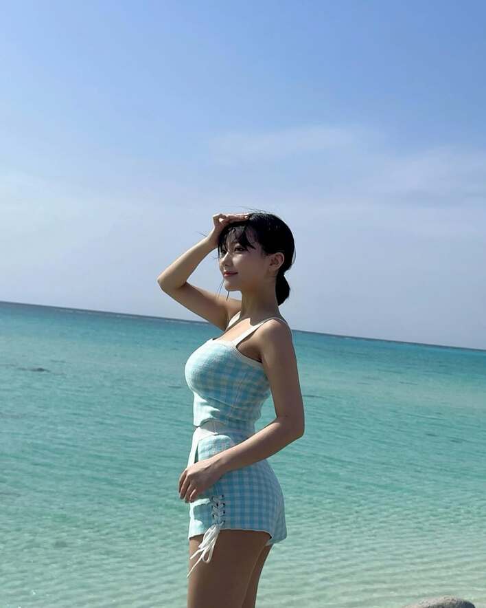 そこには、宮古島の大海原をバックに、水色のギンガムチェックのキャミソールとショートパンツのセットアップを着こなす田中さんの姿が!髪を一つに結びにし、手を頭に当て遠くを見つめるポージングをしています。夏先取りの爽やかな装いが、透き通った青い海と完全にマッチしていますね!