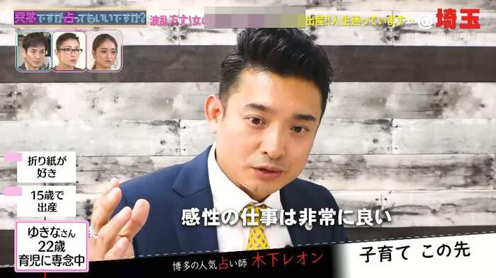 彼女の幼少期のエピソードを的中させ、恋愛面や育児のアドバイスを伝授した木下は「小さい時から折り紙好きじゃなかった?」と質問。ゆきなさんは「そうです!折り紙が好きで、ずっとやっていました」と同調した。