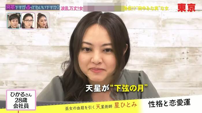続けて星は、東京在住のひかるさん(仮名、28歳)と対面。「お金に恵まれていて、金神様が憑(つ)いている。“港区の女”って感じ。場所でいうなら赤坂、あと中央区銀座」と分析すると、ひかるさんは驚きながら「今銀座に住んでいて、赤坂で働いてます!」と答え、星の見立てがさっそく的中。「“芸能人との繋がり”の星も入ってる」と星が続けると、ひかるさんは現在広告代理店で働いていると明かした。