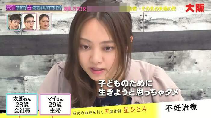 「(マイさんは)“子どもを産まなきゃいけない”と自分で決めつけちゃってるだけで、人生の楽しみが無くなっちゃってる。子どもができなくても、太郎さんはマイさんを愛し続けますよ」と夫婦の未来を占われると、2人は目頭を赤くしながら真剣に聞き入っていた。