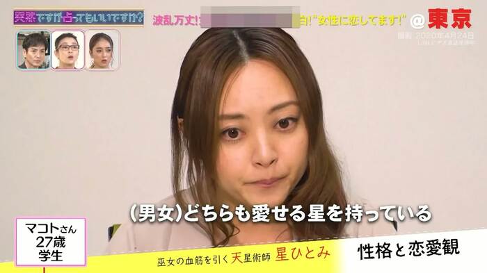 「“平等”の星。多分、“男女どちらも愛せる星”がある」と星がいうと、マコトさんは「スゴすぎ!私、パンセクシャルを自認しているんです」と続け、性別の枠を超えて全ての人が恋愛対象だと語った。「今までお付き合いした人たちは男性だったんですけど、今思えば小学生の頃から女の子も好きでした」と回顧。
