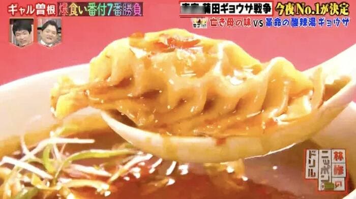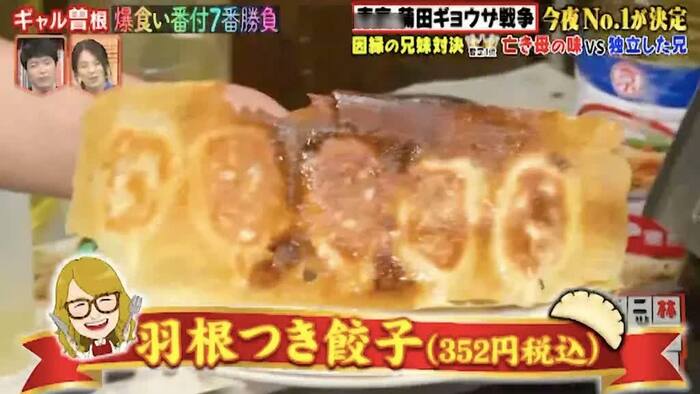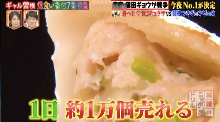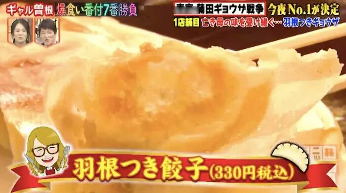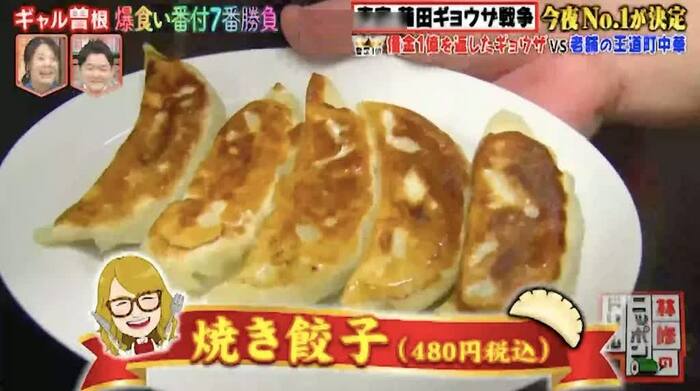 今回は「蒲田ギョウザ編」を放送。餃子の激戦区、東京・蒲田から「東京餃子通信」編集長が選んだ“トップ7”の店舗を、ギャル曽根が 1店舗ずつまわり、餃子を完食。暫定1位を決めていく勝ち残り方式で、ギャル曽根的ナンバーワンのお店を決定した。