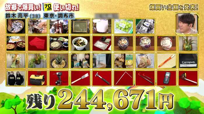 その後は中華料理店「台北飯店」やアンテナショップ「新鮮屋」で調布の人々に爆奢(おご)り。衣料店「まつざわ」では、鈴木が「最近、下着をプレゼントした仲」だという生田斗真のために、赤パンツを購入。そば処「湧水」では当時のバイト仲間と高級そばパーティに舌鼓を打ち、だるま専門店「だるチャンのおうち」では高級だるまを爆買い。手作り雑貨とお花の店「Lari-go」では95,216円分の観葉植物を購入し、着々と“爆買い恩返し”を進めた。