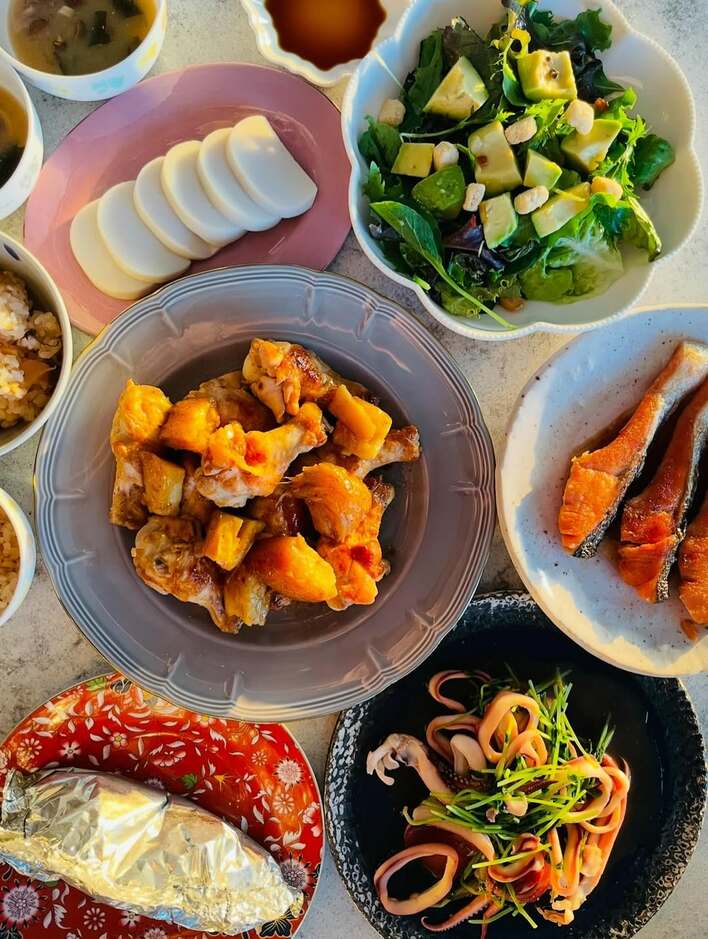 サラダに、かまぼこ、炊き込みご飯など、ボリュームと栄養満点な料理がズラリと並んでいます!1人でこの量を作るのは想像しただけでも大変ですよね…!
