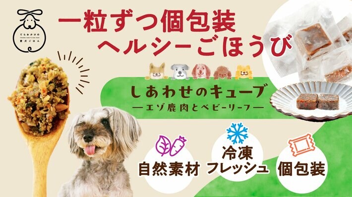 その第一弾商品として、北海道産エゾシカに加え、自社有機農場で栽培したベビーリーフなどを使用した、無添加・冷凍・個包装のフレッシュフード『しあわせのキューブ』を開発。