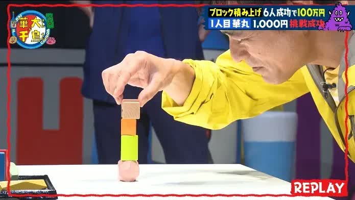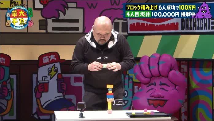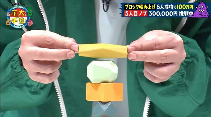 「ブロック積み上げ」は、3つ積まれた状態からスタートし、1人2個ずつ、6人で12個を積めれば100万円ゲットとなる。