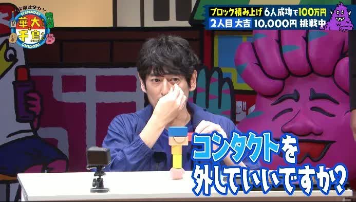 ノブはいざ挑戦が始まると、積まれたブロックに自分の持ったブロックを近づけたあたりから手がプルプル。「震えてきたな」とつぶやいた矢先、手に持ったブロックをはなしてしまい、コツンと音を立て、ブロックたちが崩れてしまった。