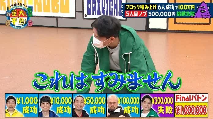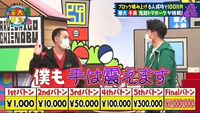 ゲストの鬼越トマホーク(坂井良多、金ちゃん)と、博多華丸・大吉、千鳥(大悟、ノブ)の6人が、1人ずつ順番にゲームに挑戦し、連続で成功すれば100万円獲得。失敗すれば獲得賞金が0円になってしまうというプレッシャーの中で、全員が成功を目指した。