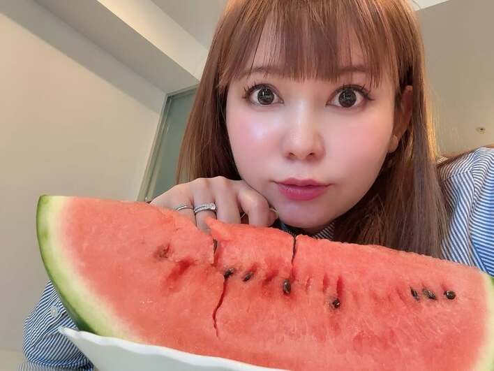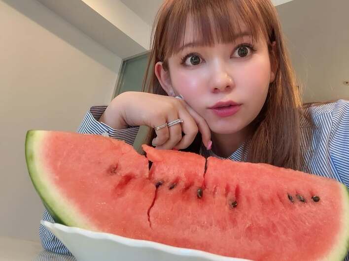 写真を見ると、カットされた大きなスイカを前に、顔に手を添える中川さんの姿が。薬指につけたキラリと光る指輪が印象的です。