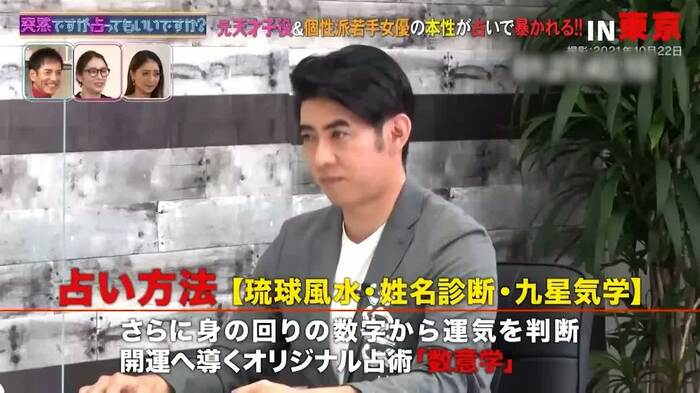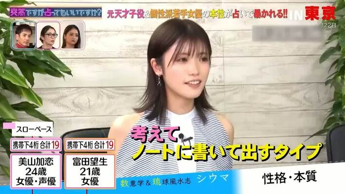 また、富田(携帯番号の下4桁合計数字は「19」、誕生日は2000年2月25日)については「しっかりしていて、お母さんみたいな性格。見た目とのイメージが違う」と診断。富田は心当たりがあるようで「『話してみたら(印象)違うね』と言われることもありますね」と同調していた。そこでシウマがすかさず「異性の心をくすぐるタイプというか、『色気あるね』とか『女子っぽいね』とか言われない?」と聞くと、富田は赤面しながら「言われることもあります…(笑)」と照れ笑いし、スタジオの沢村一樹&水野美紀&みちょぱは「かわいい!」とリアクション。