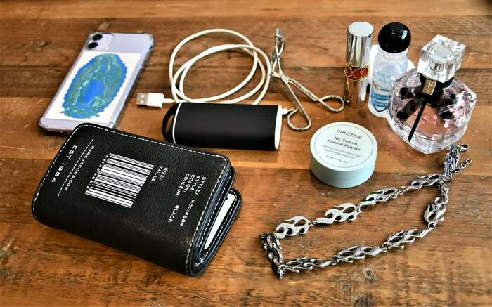 まずは、「いろんな系統の服を着るのですが、どの服にも合わせやすいので黒のバッグが多い」と、選ぶ時のこだわりを。さらに中身に関しては、「携帯と財布を除いたら、香水は忘れたくないもの1位」と明かす。