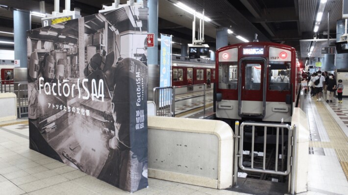 画像の説明)2024年に実施された「第3回こうばのでんしゃ FactorISM in 近鉄電車」より、大阪上本町駅9番ホームに置かれたオープンファクトリーイベント「FactorISM(ファクトリズム)」のパネル