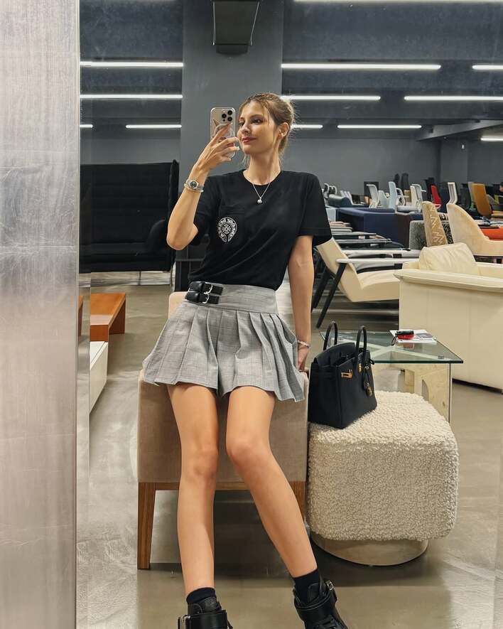 投稿には、お団子ヘアで、黒のTシャツにグレーのミニ丈のプリーツスカートを合わせたコーディネートのマギーさんが、ソファに腰掛けている自撮りショットが!