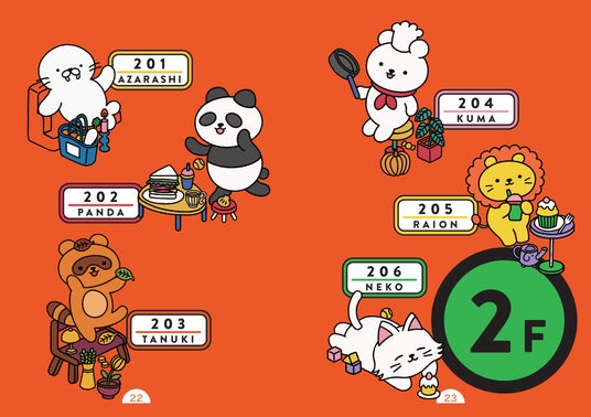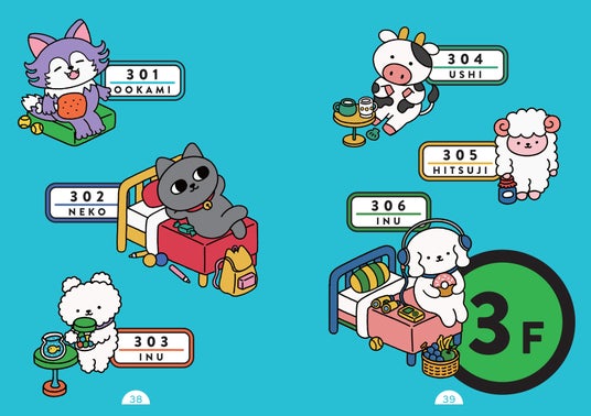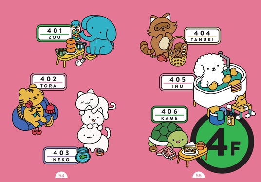 ちがいさがしの舞台は、動物たちが住むマンション。ねこや犬のほか、うさぎやペンギン……1階から5階まで、かわいい動物たちが暮らしています。