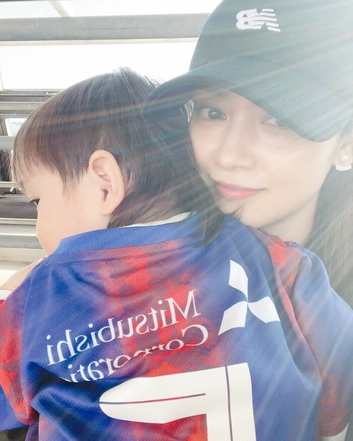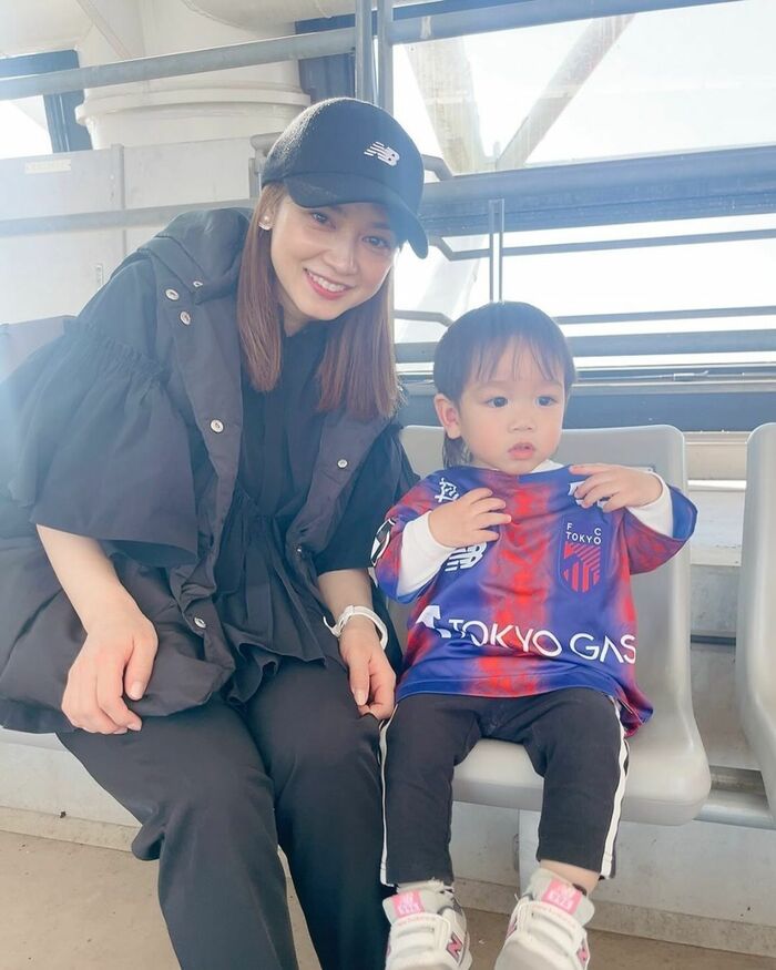 続けて、「スタジアムに流れる曲を聴いてサポーターさん達が手を叩くと同じように真似てピッチ全体をキョロキョロ なんだ‼︎ちゃんと座れるじゃないか‼︎と、嬉しくなった 前半は一緒に応援して後半は眠くなったみたいで抱っこでネンネ 応援も頑張ったね」と、四男が初めて一人で座れたことに喜びをあらわにしました。