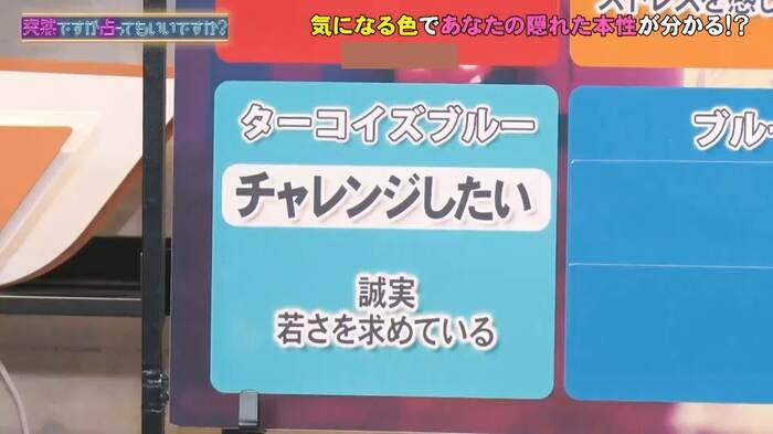 みちょぱが「好きな色でもあるんですけど、ターコイズブルーも気になってて…」とシウマにたずねると、ターコイズブルーを選んだ人は「“新しいことにチャレンジしたい”状態です。あとは“誠実さ”とか“アンチエイジング”を求めている」状態なのだそう。