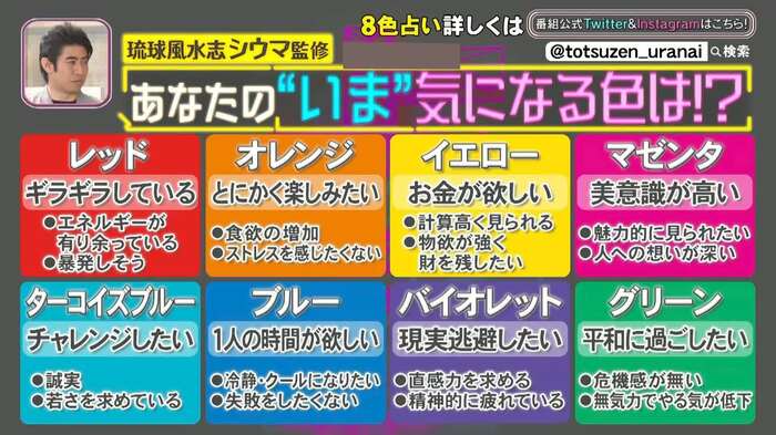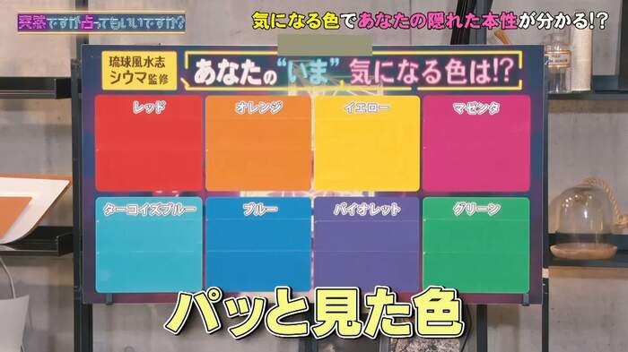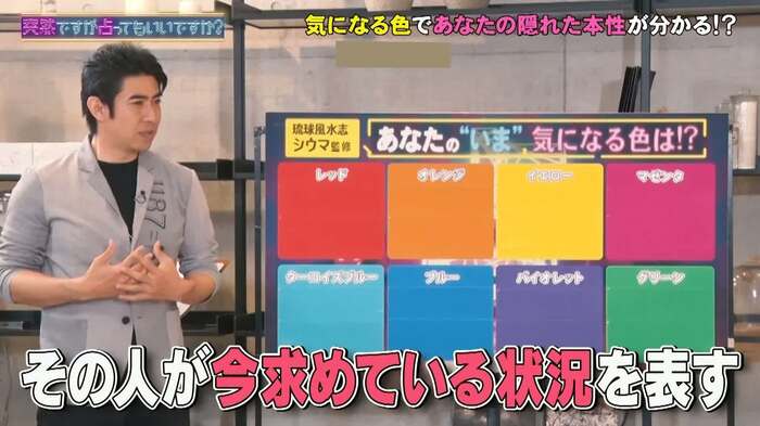 7月22日(水)の放送では、数意学や琉球風水で運勢を見る元甲子園球児の占い師・シウマが登場。選んだ色ごとに人間の本性がわかるという「8色占い」を、沢村一樹、水野美紀、みちょぱが体験した。