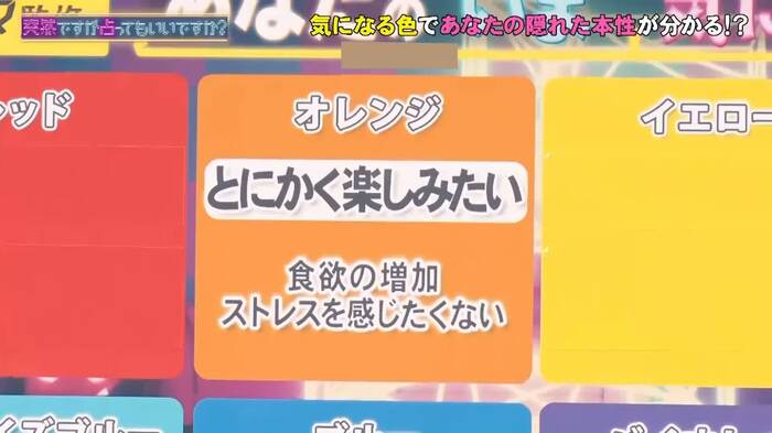 シウマによれば、「(オレンジを選んだ人は)“とにかく楽しみたい”。もっと細かく言うと、ちょっと今お腹が空いていて“食欲がある”だとか、もう今は“ストレスを感じたくない”っていう状態の人はオレンジを選びます」とのこと。