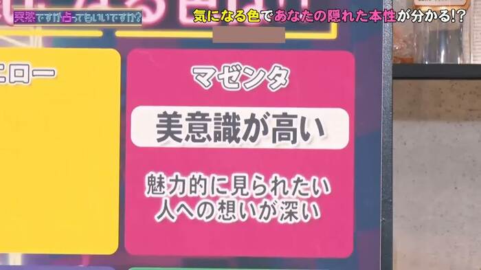 続いて、水野、みちょぱは2人とも「マゼンタ」をセレクト。「“美意識を高めたい”状態です。“魅力的に見られたい”だとか、“愛情を誰かに注ぎたい”っていう状態ですね」というシウマに対し、水野は「ちょうどメイクと着替えをし終えて、これから収録っていうタイミングだから、当たってるんじゃないですかね?」と納得したようだった。