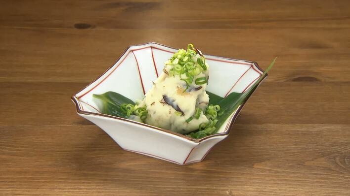 数の子ポテサラ(490円)をいただき、さらに安斉のリクエストで、みかんサーモン(愛媛県宇和島産 ※越後屋竜庵のメニュー外)をご用意。麦焼酎のソーダ割りで乾杯。※すべて税別