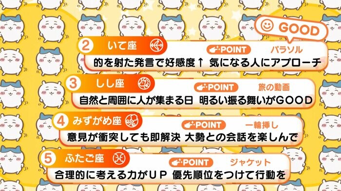 『めざましテレビ』で放送中の「ちいかわ占い」 テレビ放送がない日はお休みで、月~土:朝7時以降に更新予定です。
