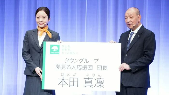 タウングループの今年のテーマ「応援」にちなみ、本田は「夢見る人応援団 団長」に任命され、大型の名刺を受け取った。