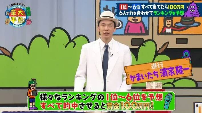 秋山と博多華丸・大吉、千鳥(大悟・ノブ)、山内健司(かまいたち)の6人が協力して、自分たちに関するランキングの1位から6位までを予想。順位をぴったり的中させると賞金100万円が獲得できる。