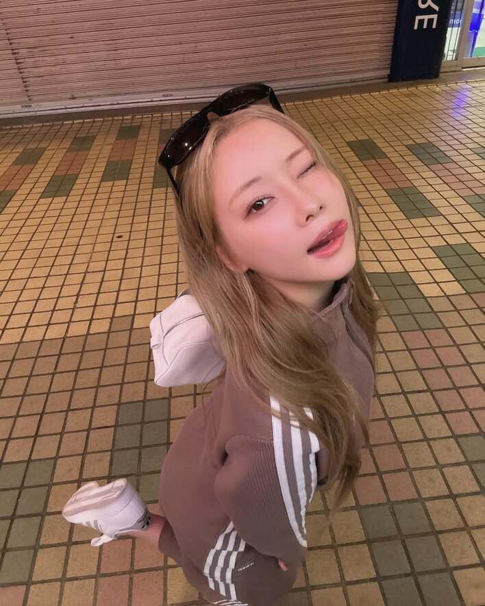 そこには、ブラウンのセットアップに身を包み、adidasの白のスニーカーを履いたスポーティーな装いで、サングラスを鼻の低い位置でかけた重盛さんの姿が!