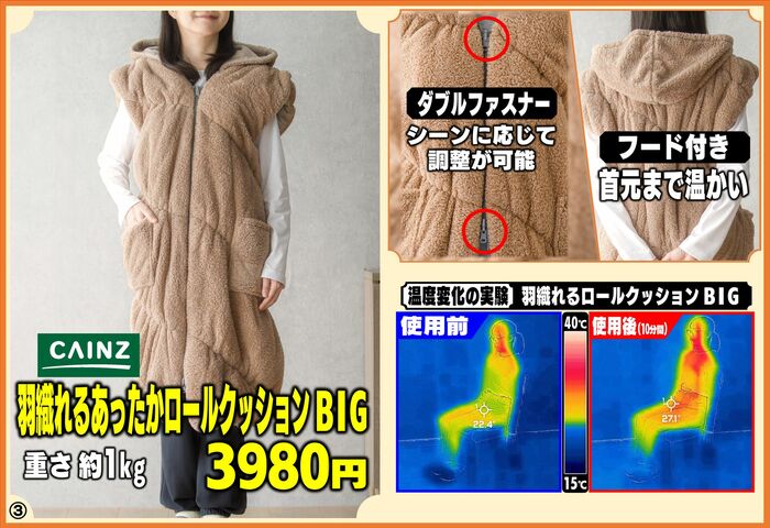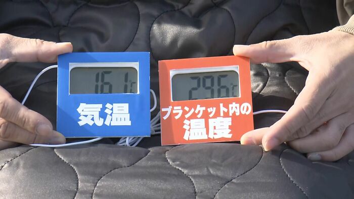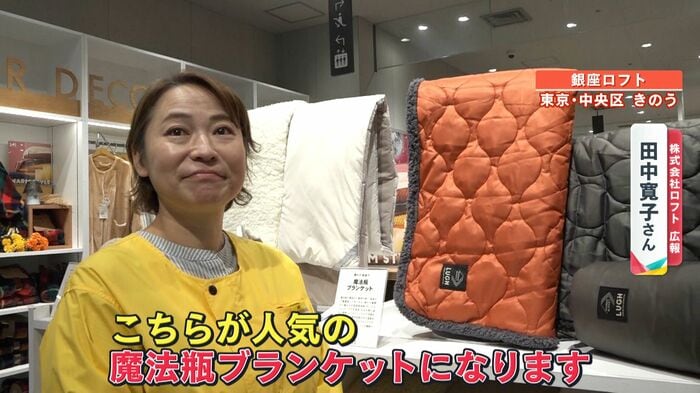 こちらが人気の魔法瓶ブランケットになります。先週の(防寒グッズでの)売り上げが1位になってます。