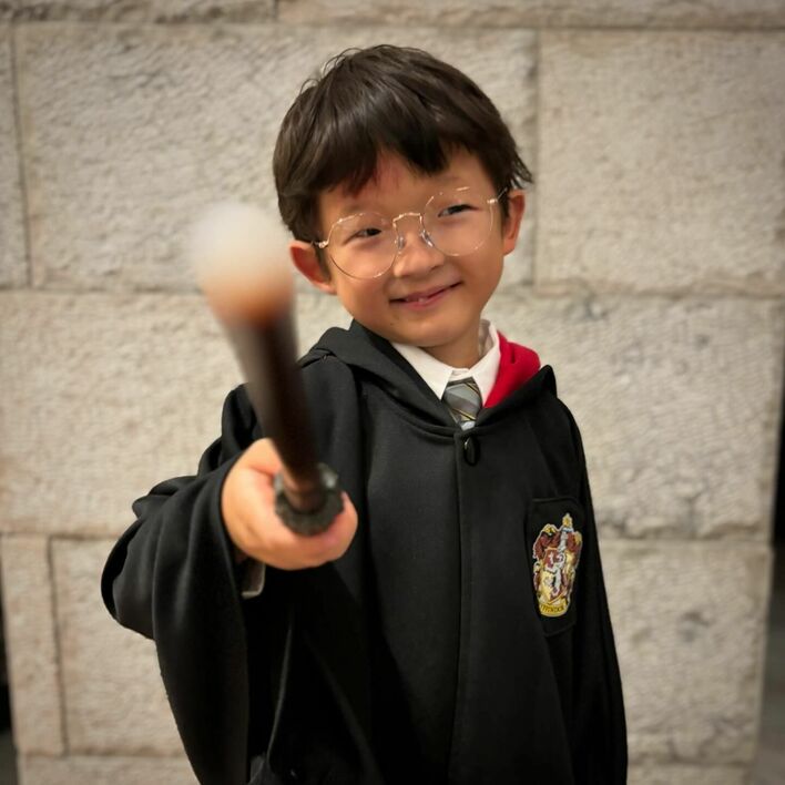公開された写真には、『ハリー・ポッター』のローブを着た陽喜くんが、杖を持ってカメラに向けて魔法をかけるポーズをしている姿が!