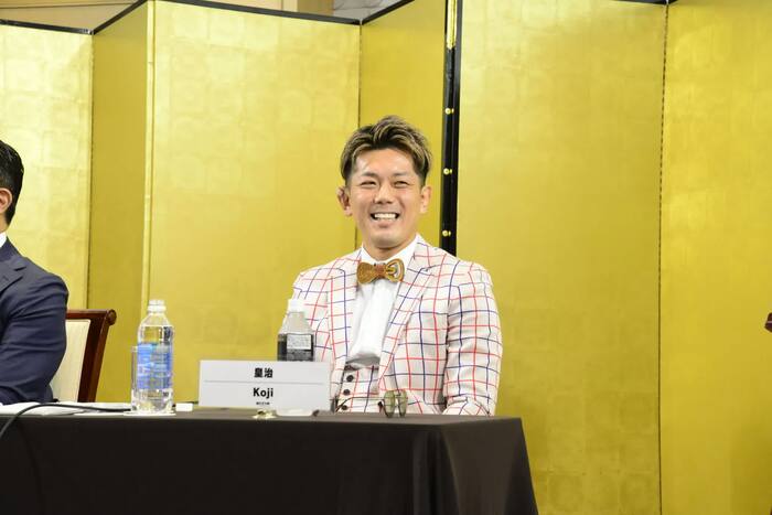 改めて「K-1から来ました皇治です。強いんです、俺。なぜ自分がここに来たかというと、31歳ですが、一丁前にしゃべれているのはK-1があったから。本当はK-1の選手として、ここに来たいと話をしていたが、セ・リーグの選手がパ・リーグにいきなり行けないのと一緒でルールがあります。最後のチャレンジだと思い練習場を去り、K-1に違約金も払ってきました」とコメントした。
