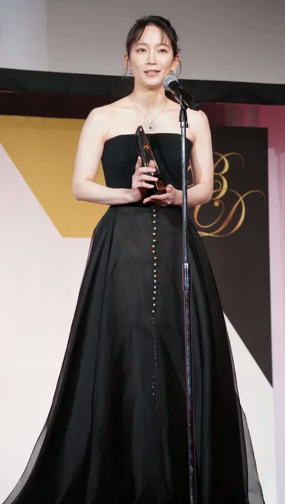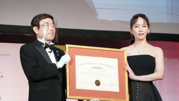 吉岡は、オフショルダーの黒いロングドレス姿でレッドカーペットに登場し、表彰状とトロフィーを授与されると、「ありがとうございます、光栄です」と感謝。衣装については「真ん中にあしらわれているパールがかわいらしくて、個人的に気に入ってます」とはにかんだ。
