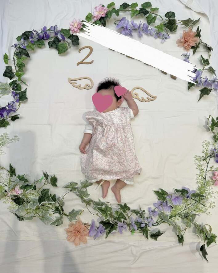 花柄のワンピースを着てすやすやと眠る次女のまわりに紫やピンクの花と天使の羽が飾られた、とってもかわいらしい写真を披露し、菊地さんは投稿文で「3泊のお休みをもらった気分でとてもリフレッシュしました」とコメント。