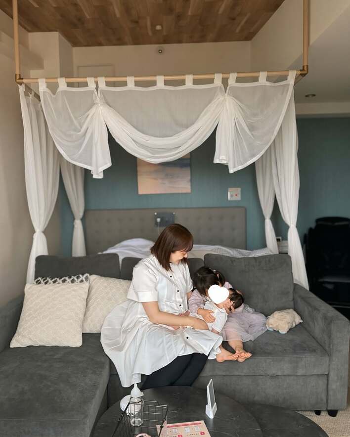 写真には、リゾート感あふれる空間で白いカーテンに囲まれた大きなベッドの前にあるグレーのL字ソファに2人の娘と座りながらゆったりとくつろいでいる菊地さんの姿や…