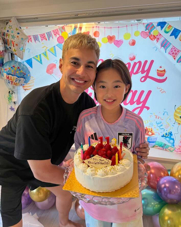 笑顔でバースデーケーキを手にするリリーちゃんと、横に寄り添うユージさん。親子の仲の良さがうかがえます。