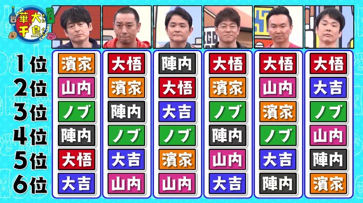 ゲストに、陣内智則さんを迎え「6連単!ぴったり当てたら100万円」に挑戦。博多華丸さん、博多大吉さん、千鳥(大悟さん、ノブさん)、かまいたち(山内健司さん、濱家隆一さん)さんを含めた6人がランキングに参加し、お題に対して全員で順位を予想しました。